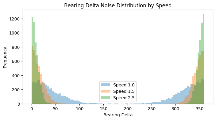 Now for the final step - the bearing. The bearing is calculated from successive position fixes, so if the device is moving slowly, the distance between these fixes is tiny, making the direction calculation quite sensitive to small GPS position errors [5]. Reflecting this, our model applies a more substantial random noise when the simulated speed drops below 1.5 m/s, drawing from a normal distribution with a mean of 0 and a hefty standard deviation of 45 degrees. Once the speed picks up beyond that 1.5 m/s threshold, GPS bearing typically becomes more stable. The accuracy generally improves as the vehicle moves faster because the distance between position fixes increases, making the direction calculation less susceptible to minor positional noise [6]. Our simulation mirrors this by calculating the noise’s standard deviation as inversely proportional to the speed (using a scaling factor of 30.0 degrees*m/s). However, since no GPS is perfect, even at higher speeds, we ensure there’s always a touch of uncertainty by setting a minimum noise standard deviation of 2.0 degrees. This generated noise is then added to the true bearing, and the result is neatly wrapped to stay within the 0–360 degree range, giving us our final, realistically noisy, bearing.