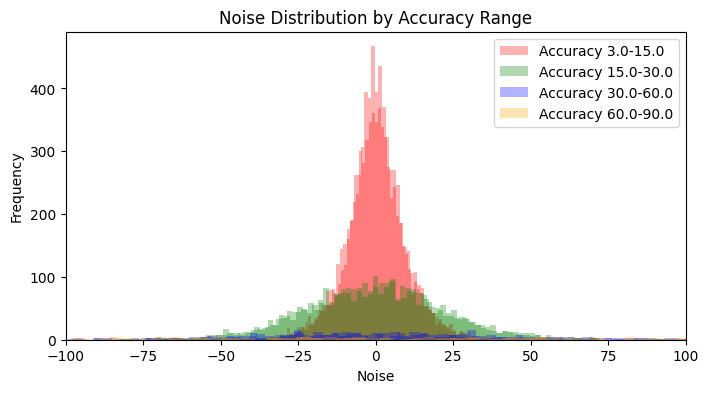 So now that we’ve got the samples and an accuracy for each one, we can start introducing noise to each set of coordinates. This noise depends upon the accuracy we’ve set to the point, since the samples can be in any place inside this horizontal measurement, based on normal distribution. So we set our noise with mean 0 and std of the accuracy, and we generate the noise. The overall distribution of noise will seem like one single normal distribution, but when we separate it by the accuracy, we’ll see its multiple normal distributions behaving differently from one another, due to our parameters and number of samples in each group. With our sample points and their GPS accuracy established, it’s time to introduce some realistic positional noise. The amount of noise added to each coordinate is directly tied to its pre-assigned accuracy value. We model this uncertainty by assuming the error around the initially calculated location follows a normal distribution. Specifically, for each coordinate, we generate noise from a normal distribution with a mean of zero and a standard deviation that matches the point’s specific accuracy value (in meters). Interestingly, if you looked at all the applied noise collectively, it might resemble a single normal distribution. However, it’s more nuanced than that. When you consider the noise based on our defined accuracy tiers (optimal, sub-optimal, etc.), it becomes clear that the overall effect is a composite of multiple distinct normal distributions. Each tier contributes a distribution with a different spread (its standard deviation), shaping a more varied and ultimately more realistic scatter of GPS points.